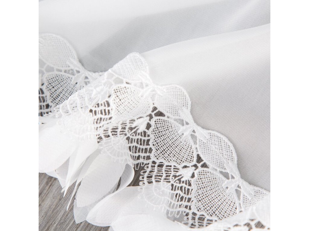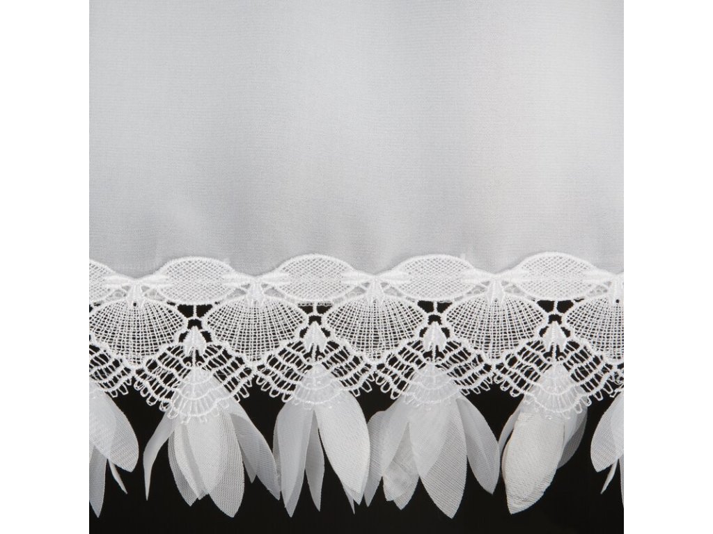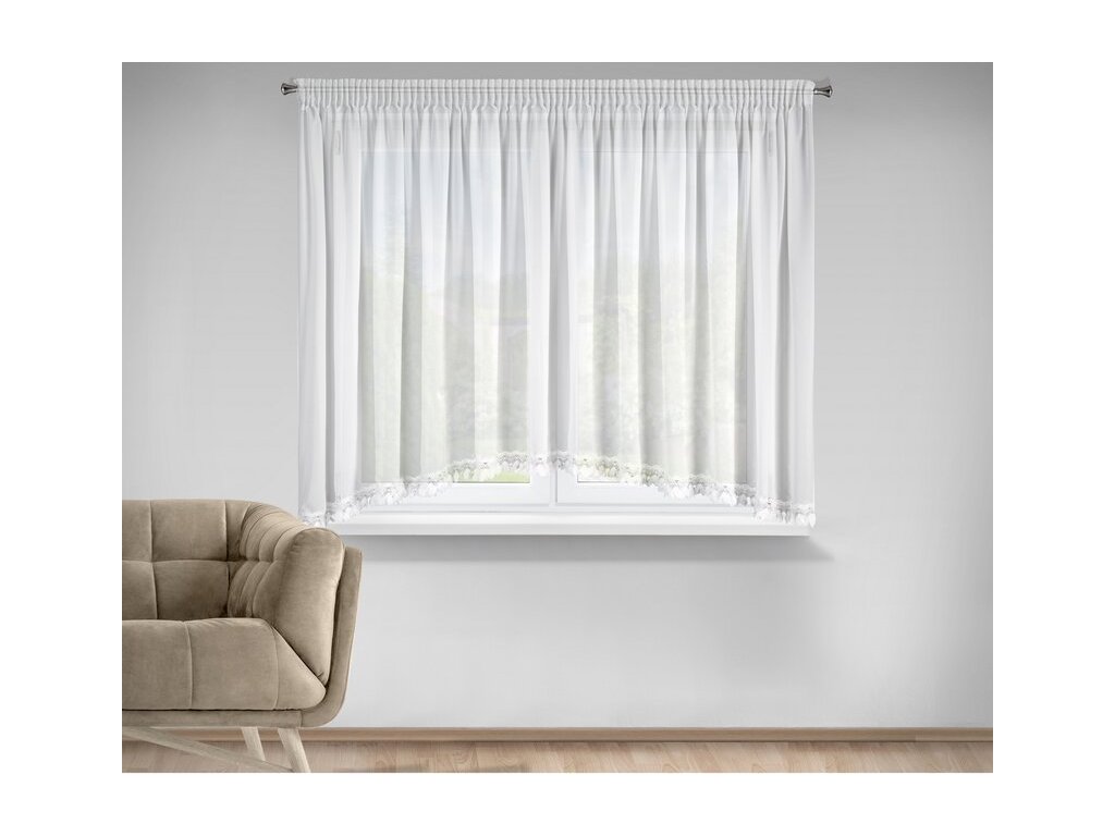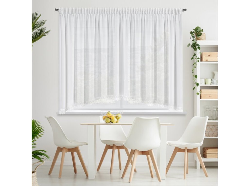 Ez a kész függöny, finom applikációval és díszszalaggal díszítve, romantikus és időtlen stílusával tűnik ki. A fehér árnyalat gyönyörűen felderíti a szobát, könnyedséget hoz és optikailag megnöveli azt.