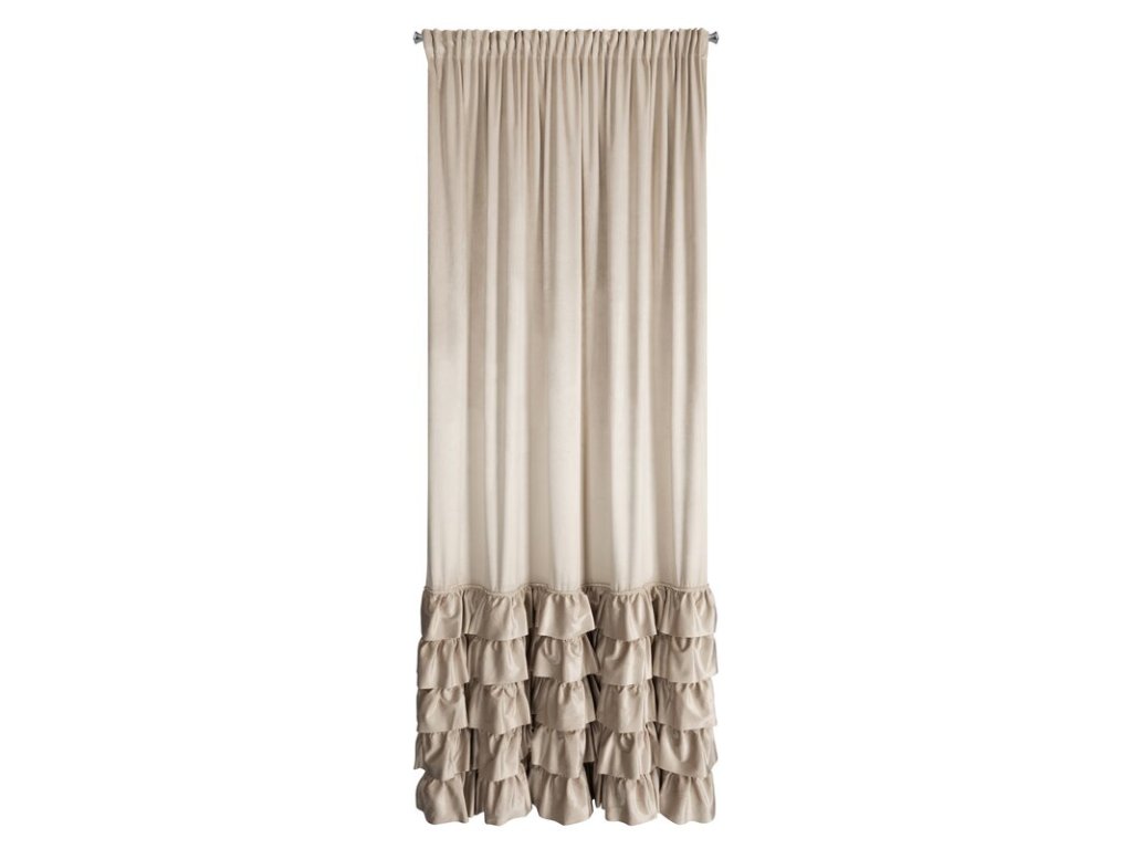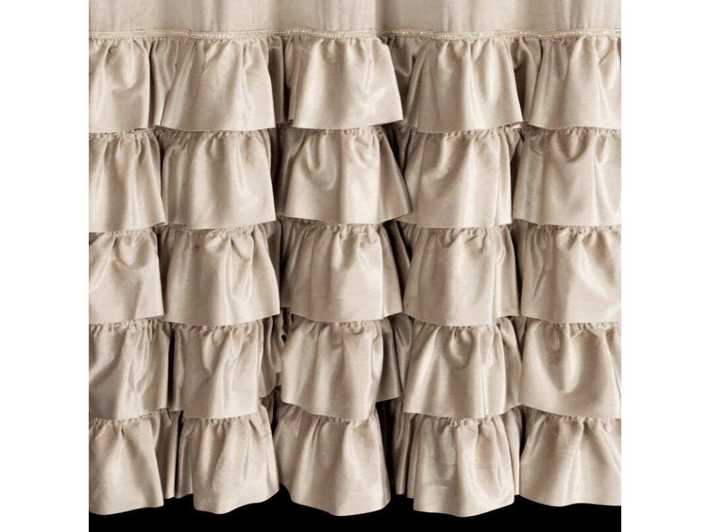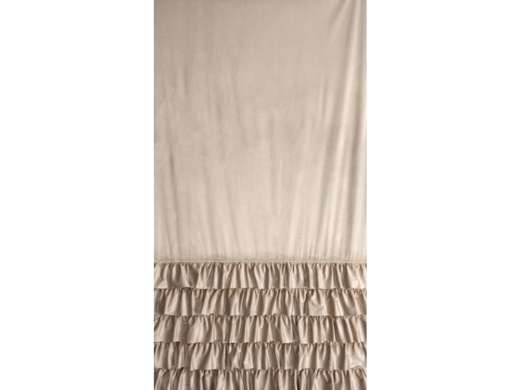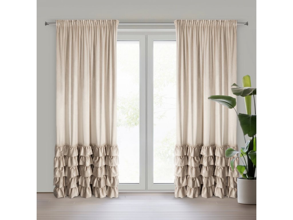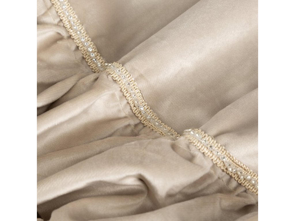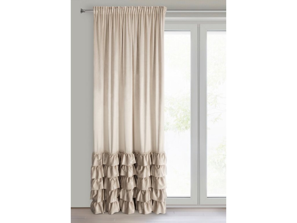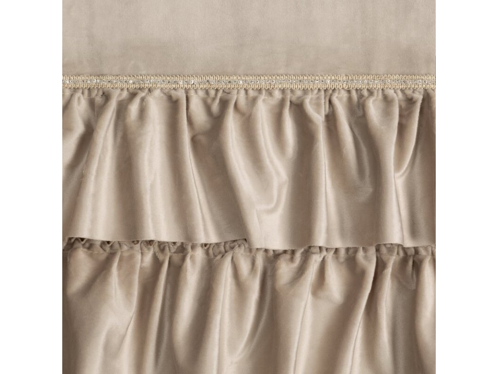 Ez az egyedi díszítőelem nem csak eleganciát ad minden helyiségnek, hanem kényelmet és magánéletet is biztosít. A puha és elegáns bársonyszövetet fényűző fény és színmélység jellemzi. A Velvet kiváló hő- és hangszigeteléséről ismert. Az exkluzív anyag rendkívül puha és kellemes tapintású, ami hangulatossá és kellemessé teszi a belső teret. A függöny alsó részét gyönyörű fodrok díszítik, amelyek könnyedséget és romantikát kölcsönöznek neki. A fodrokat egy finom, cirkóniával díszített csík választja el, ami hangulatot és kifinomultságot kölcsönöz az egésznek. A függöny felső részébe varrt, 8 cm széles univerzális rugózási szalag lehetővé teszi a ruccolás sűrűségének beállítását, így az anyag a függönyrudara akasztva elegáns megjelenésű. A szalag felett egy speciális három centiméteres fül esztétikusan takarja a húzókat vagy horgokat, amelyekre akasztják. A szalagnak van egy alagútja is, amely lehetővé teszi a függöny rögzítését egy rúd függönyrúdhoz.