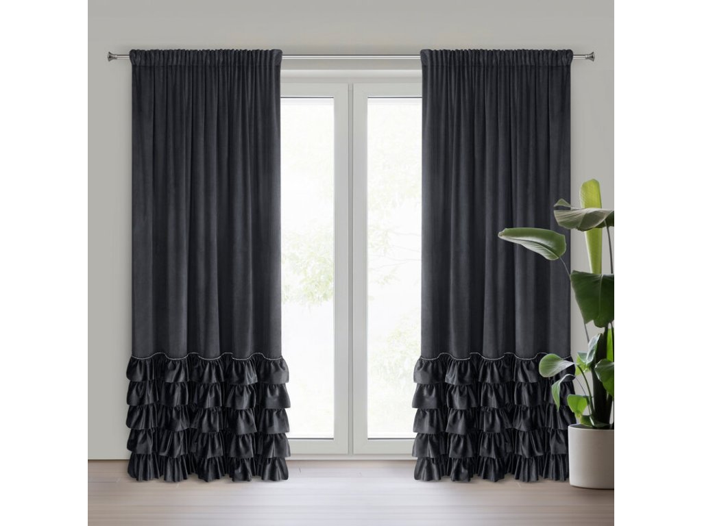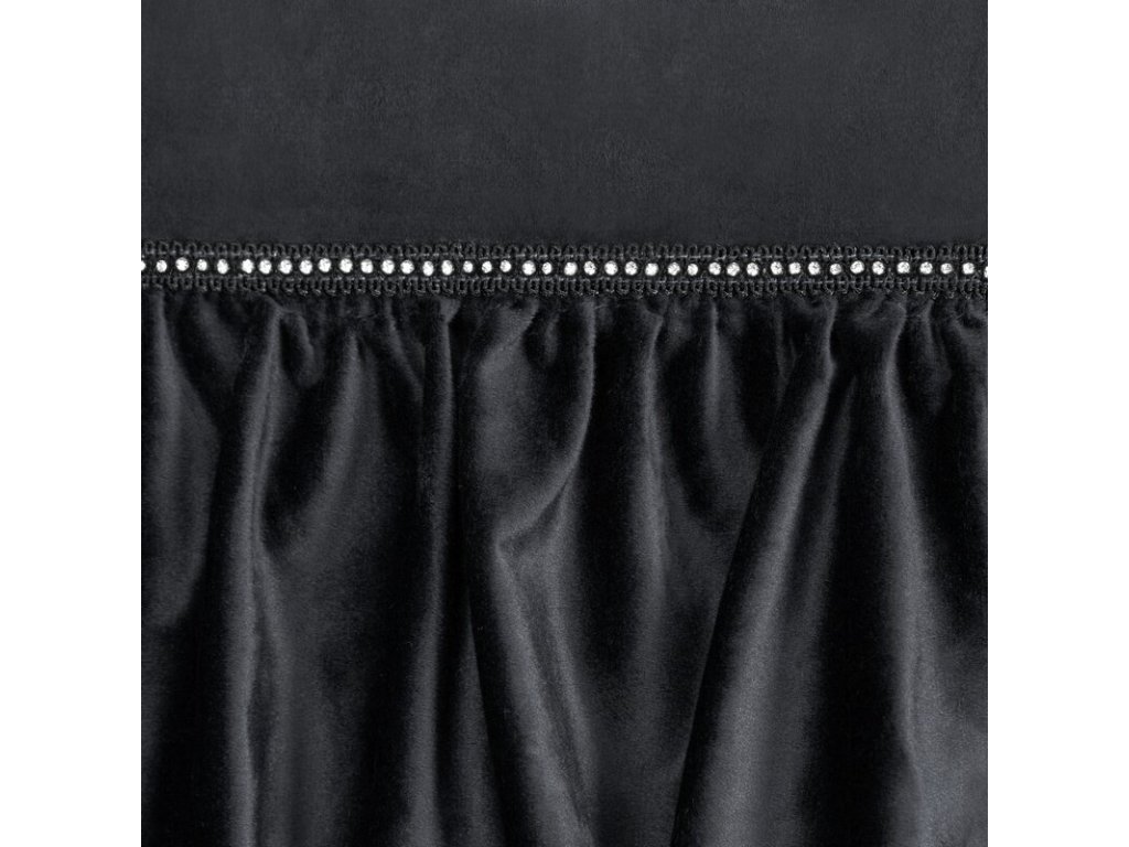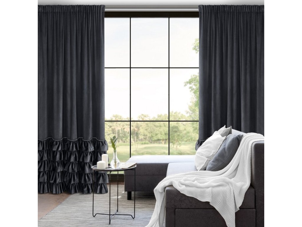 Ez az egyedi díszítőelem nem csak eleganciát ad minden helyiségnek, hanem kényelmet és magánéletet is biztosít. A puha és elegáns bársonyszövetet fényűző fény és színmélység jellemzi. A Velvet kiváló hő- és hangszigeteléséről ismert. Az exkluzív anyag rendkívül puha és kellemes tapintású, ami hangulatossá és kellemessé teszi a belső teret. A függöny alsó részét gyönyörű fodrok díszítik, amelyek könnyedséget és romantikát kölcsönöznek neki. A fodrokat egy finom, cirkóniával díszített csík választja el, ami hangulatot és kifinomultságot kölcsönöz az egésznek. A függöny felső részébe varrt, 8 cm széles univerzális rugózási szalag lehetővé teszi a ruccolás sűrűségének beállítását, így az anyag a függönyrudara akasztva elegáns megjelenésű. A szalag felett egy speciális három centiméteres fül esztétikusan takarja a húzókat vagy horgokat, amelyekre akasztják. A szalagnak van egy alagútja is, amely lehetővé teszi a függöny rögzítését egy rúd függönyrúdhoz.