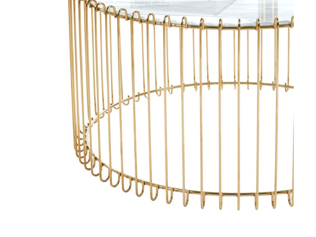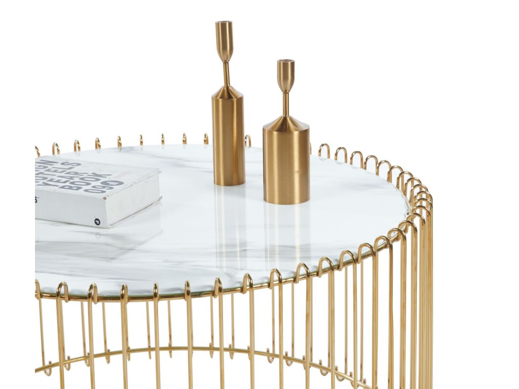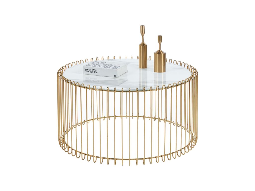 A GOLDEN MARBLE dohányzóasztal tömör arany fém talpra épül, dekoratív "drótvázas" szerkezettel, amely könnyű, elegáns és egyben stabil is. A teteje kiváló minőségű üvegből készült, fehér márvány mintával, amely rendkívül sokoldalú, luxus és könnyen karbantartható.