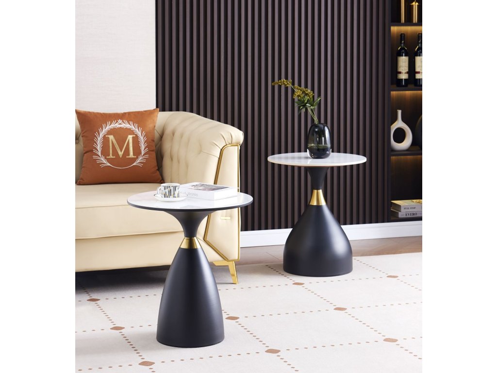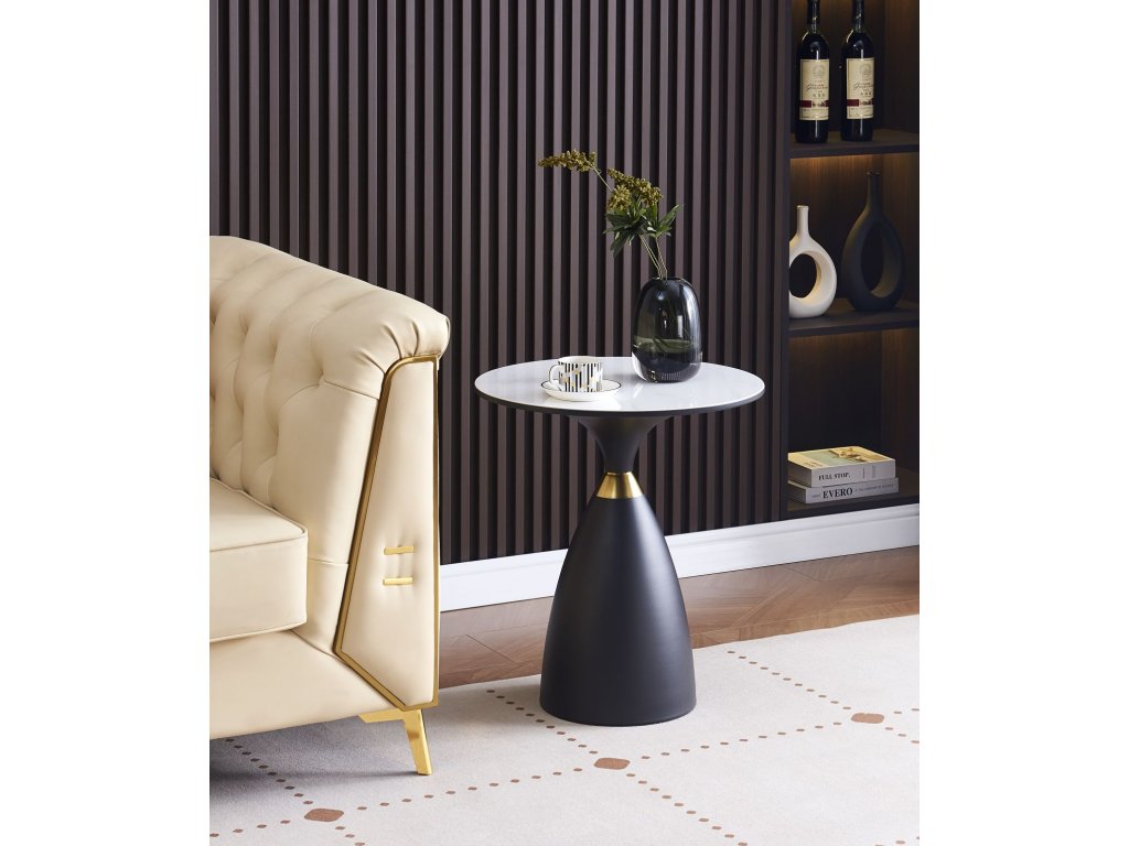 A prémium kerámiából készült, fehér márvány díszítésű asztallap elegáns, karcálló és könnyen karbantartható. A matt fekete, arany díszítésű, stabil fém talp luxus megjelenést kölcsönöz az asztalnak, és kiváló stabilitást biztosít.