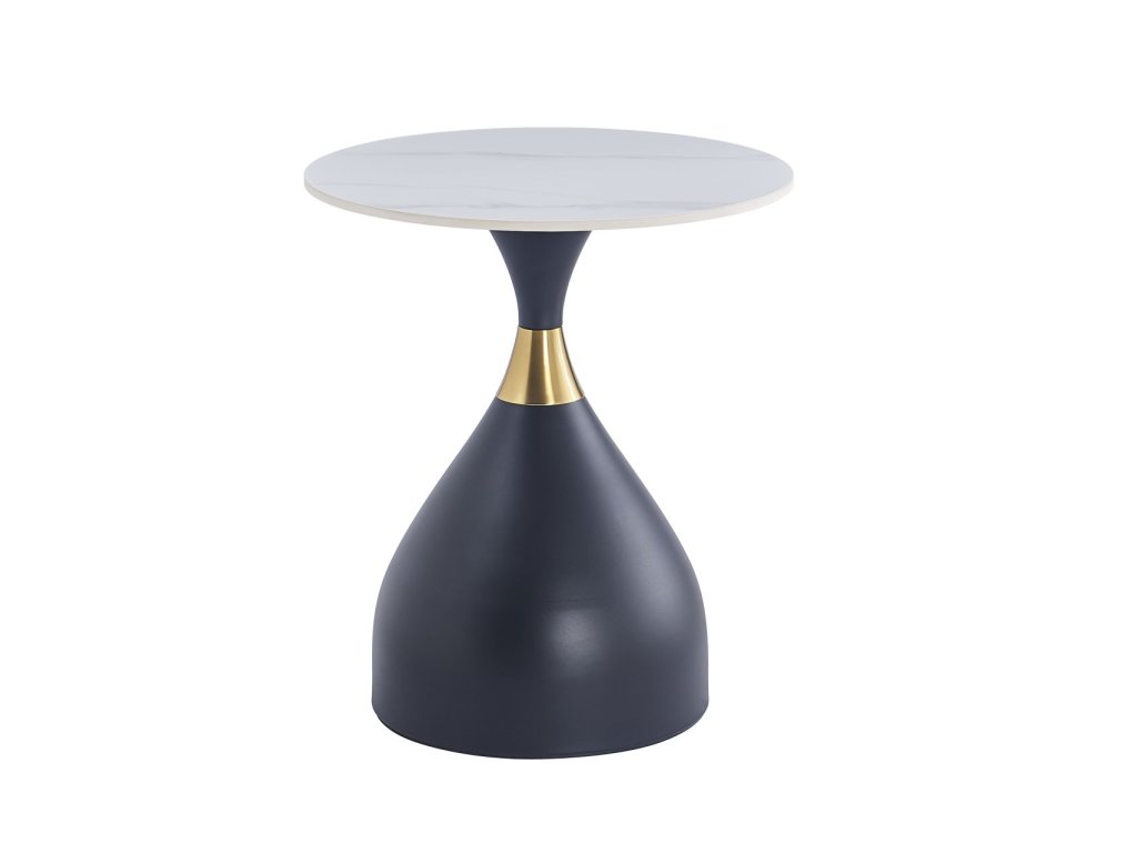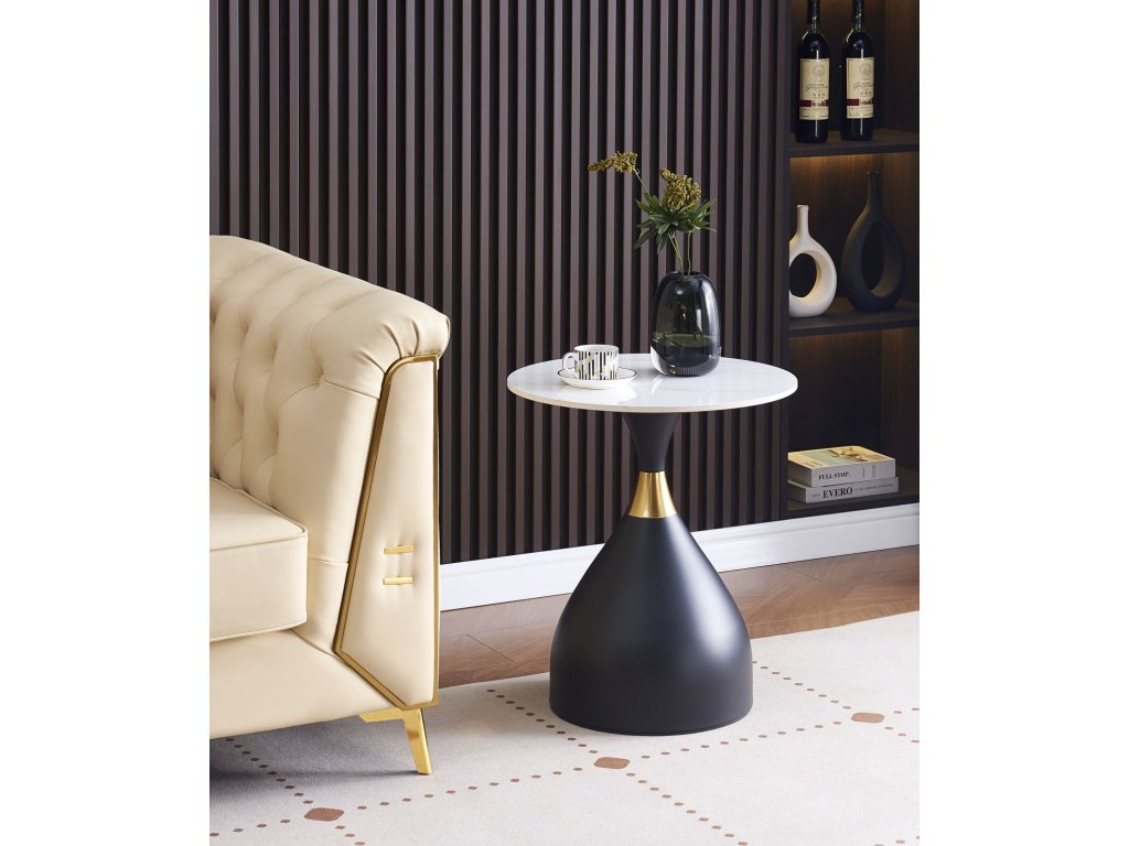 A prémium kerámiából készült, fehér márvány díszítésű asztallap elegáns, karcálló és könnyen karbantartható. A matt fekete, arany díszítésű, stabil fém talp luxus megjelenést kölcsönöz az asztalnak, és kiváló stabilitást biztosít.