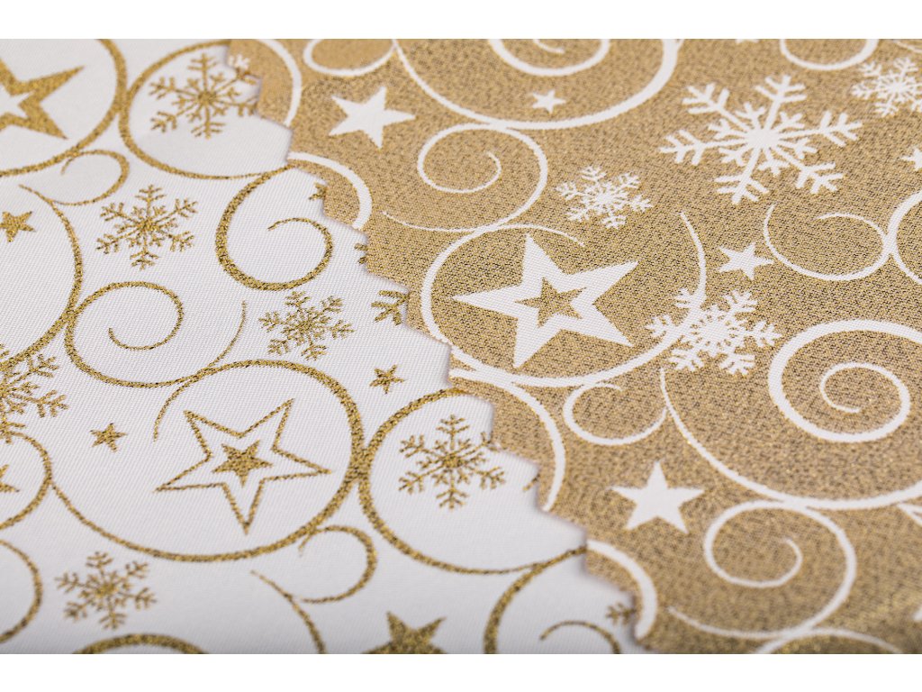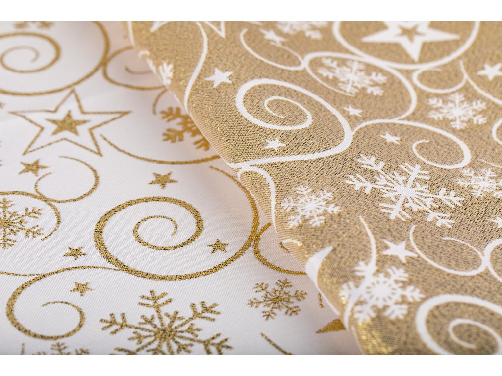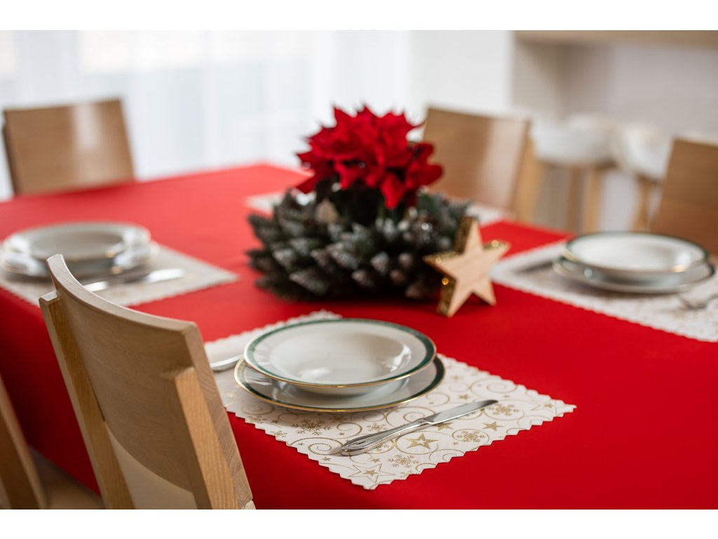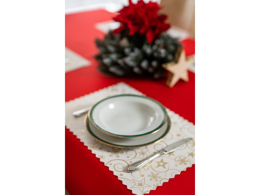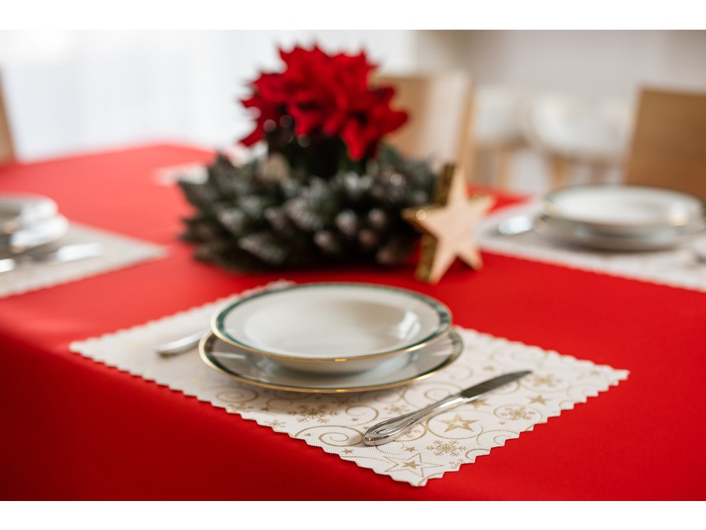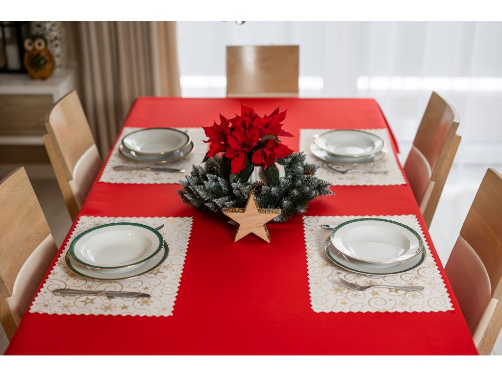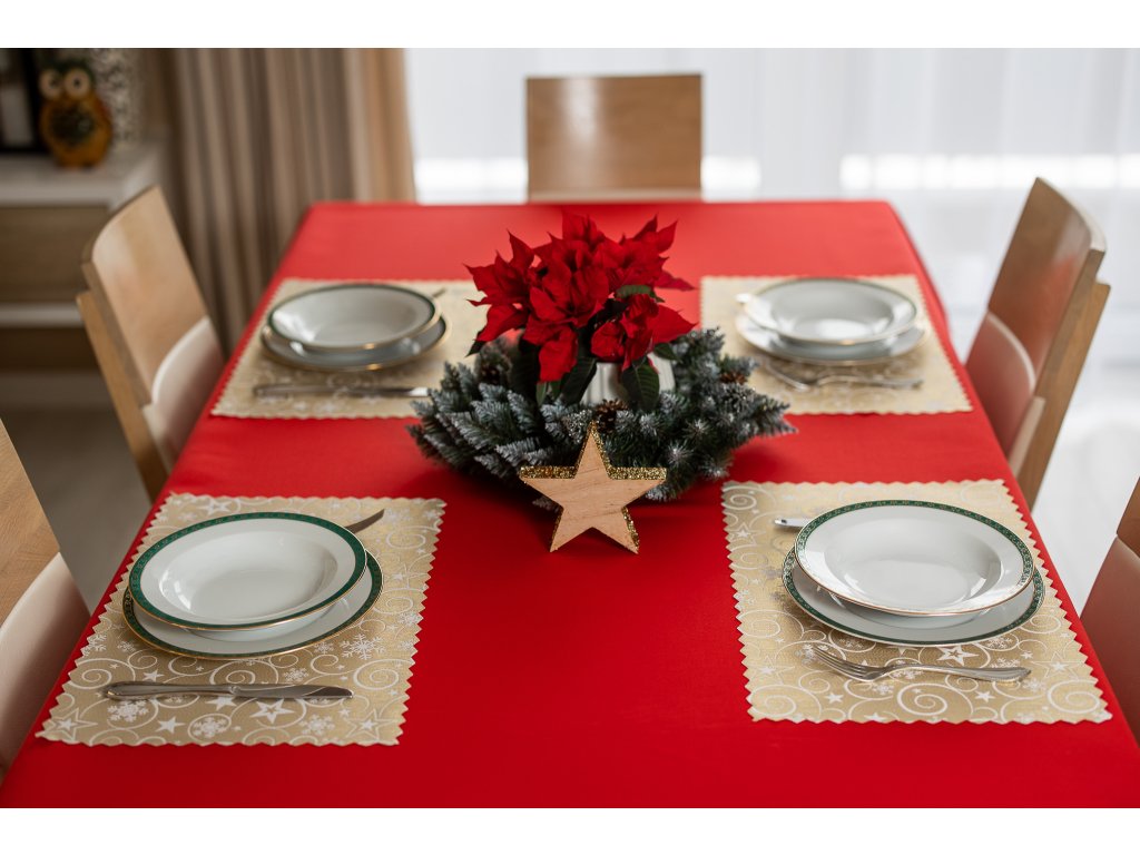 Az arany színű fényűző karácsonyi terítő az esztétikai funkciók mellett praktikus funkciókkal is rendelkezik. Megvédi az asztallapot, ugyanakkor elegáns megjelenésű.