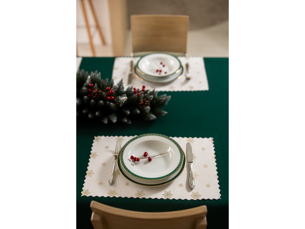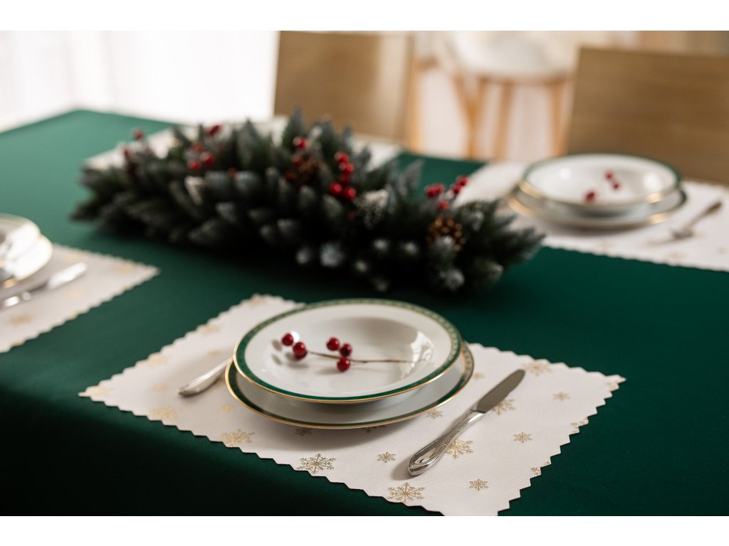 Luxus karácsonyi terítő hópelyhekkel, zöld-arany SW28 - 2 darabos szett