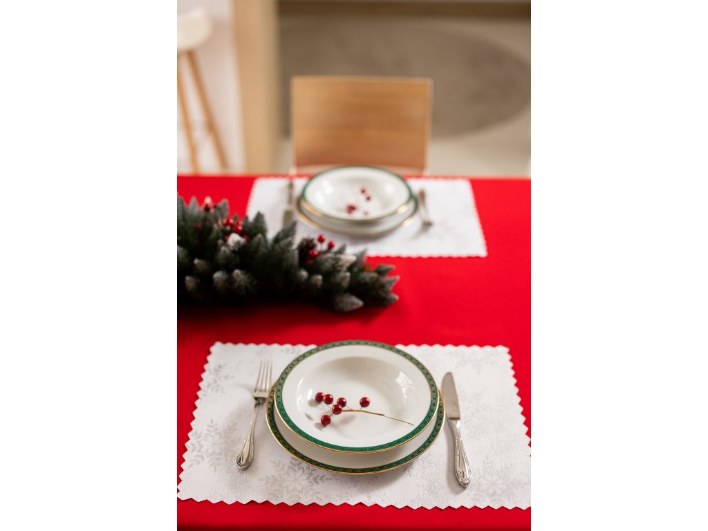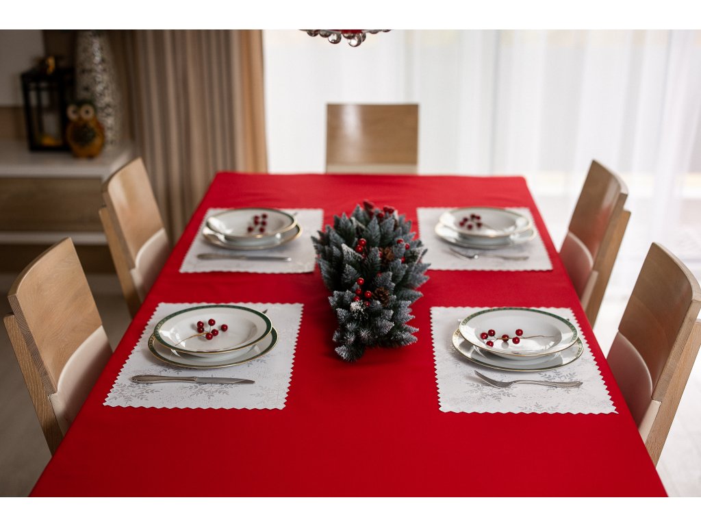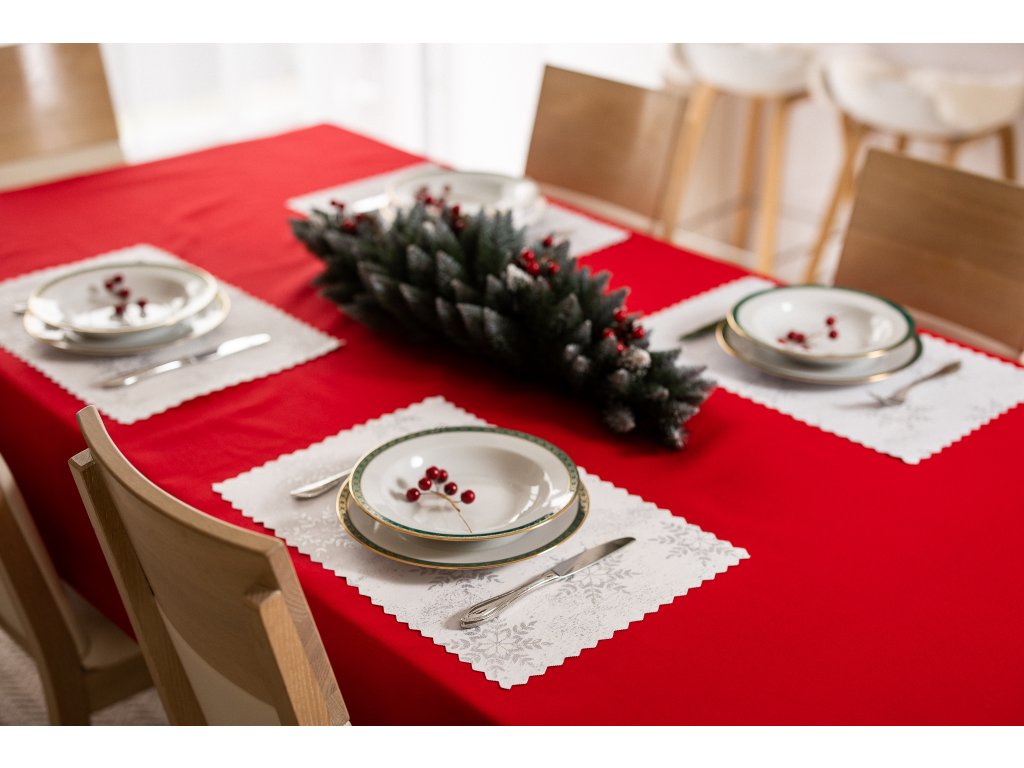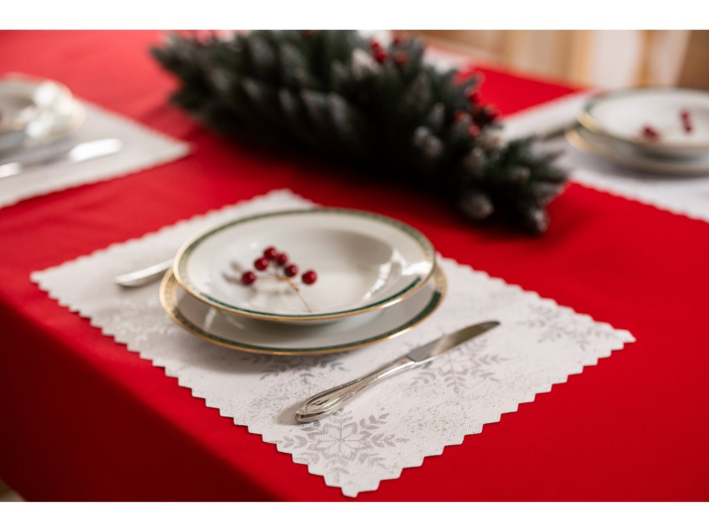 Az ezüst színű fényűző karácsonyi terítő az esztétikai funkciók mellett praktikus funkciókkal is rendelkezik. Megvédi az asztallapot, ugyanakkor elegáns megjelenésű.