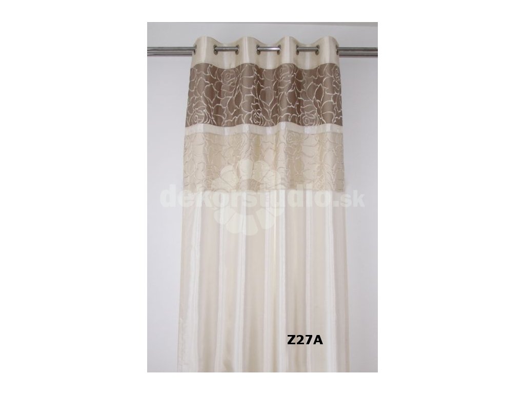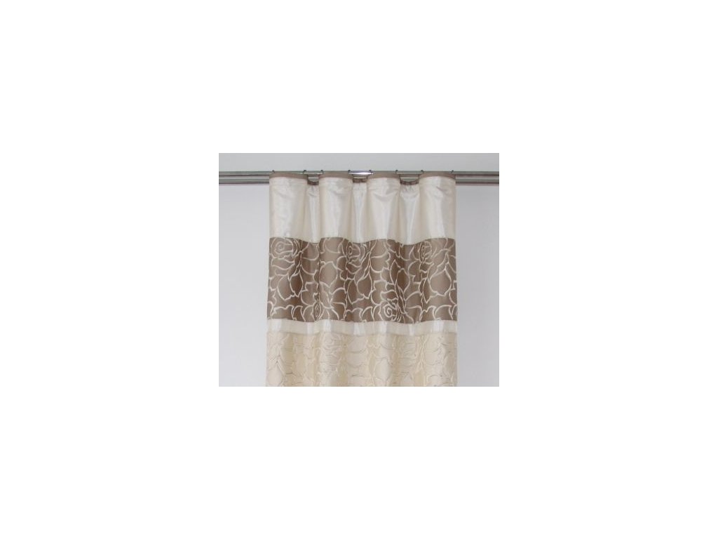 A gyönyörű, bézs és krémszínű dombornyomott díszítéssel ellátott, luxus függöny készen áll a felakasztásra.