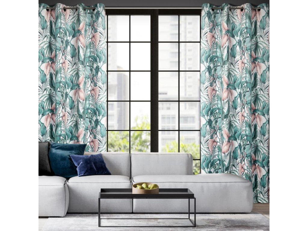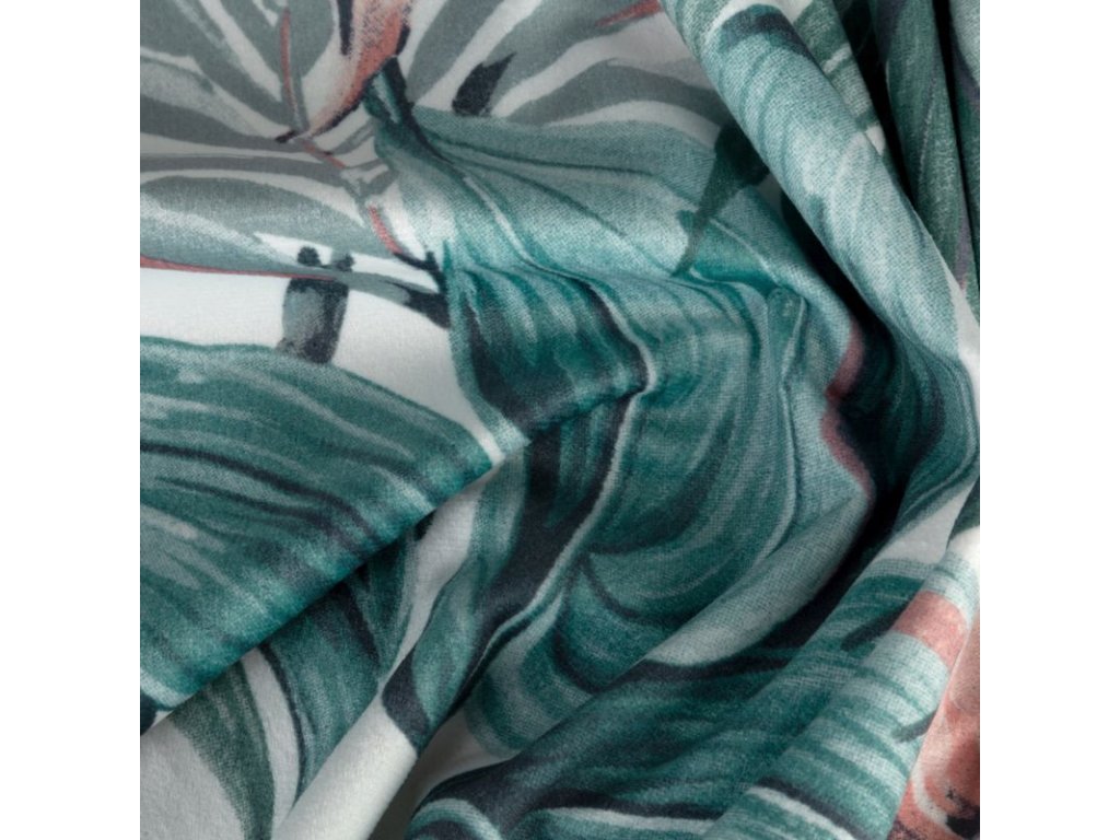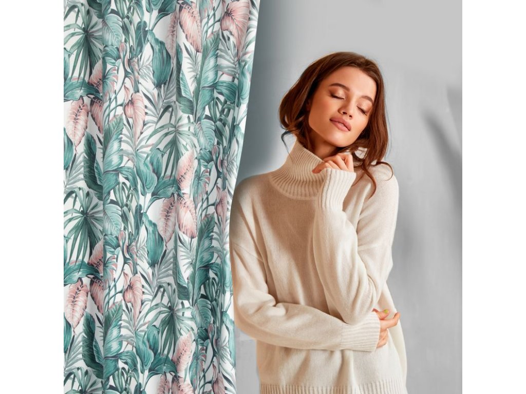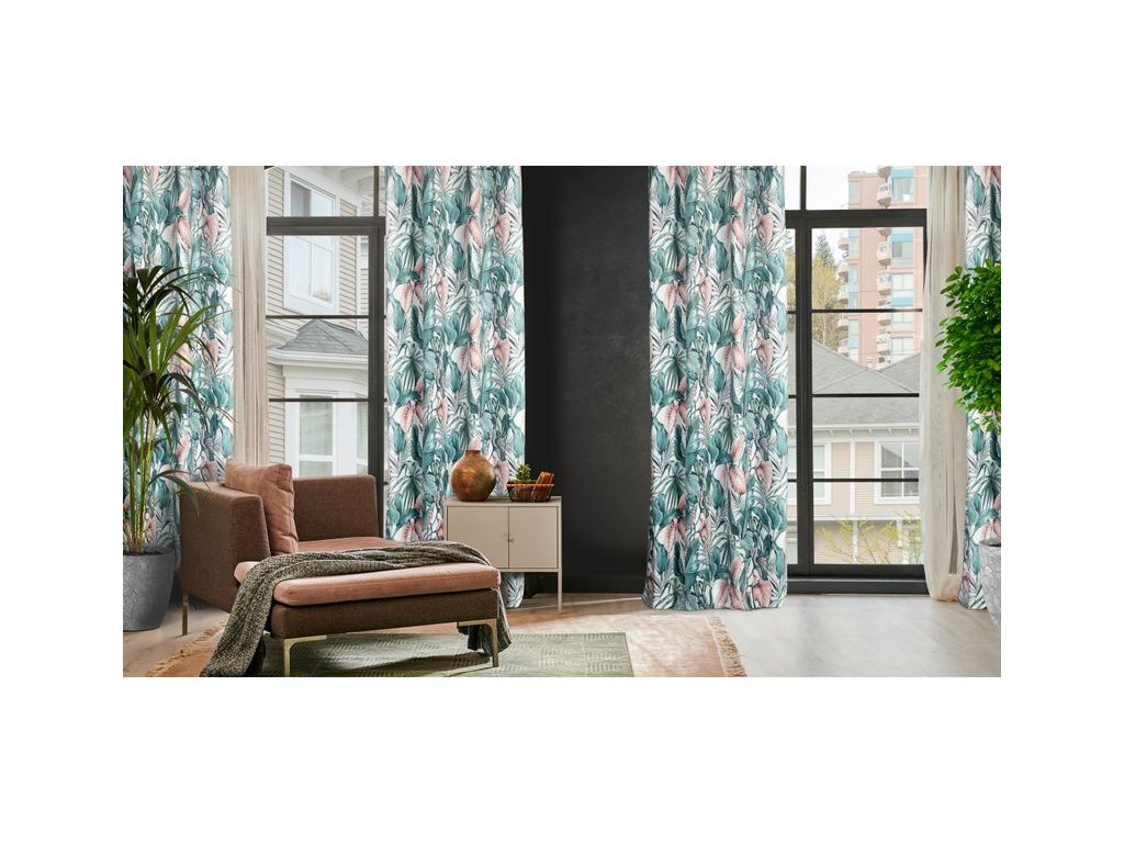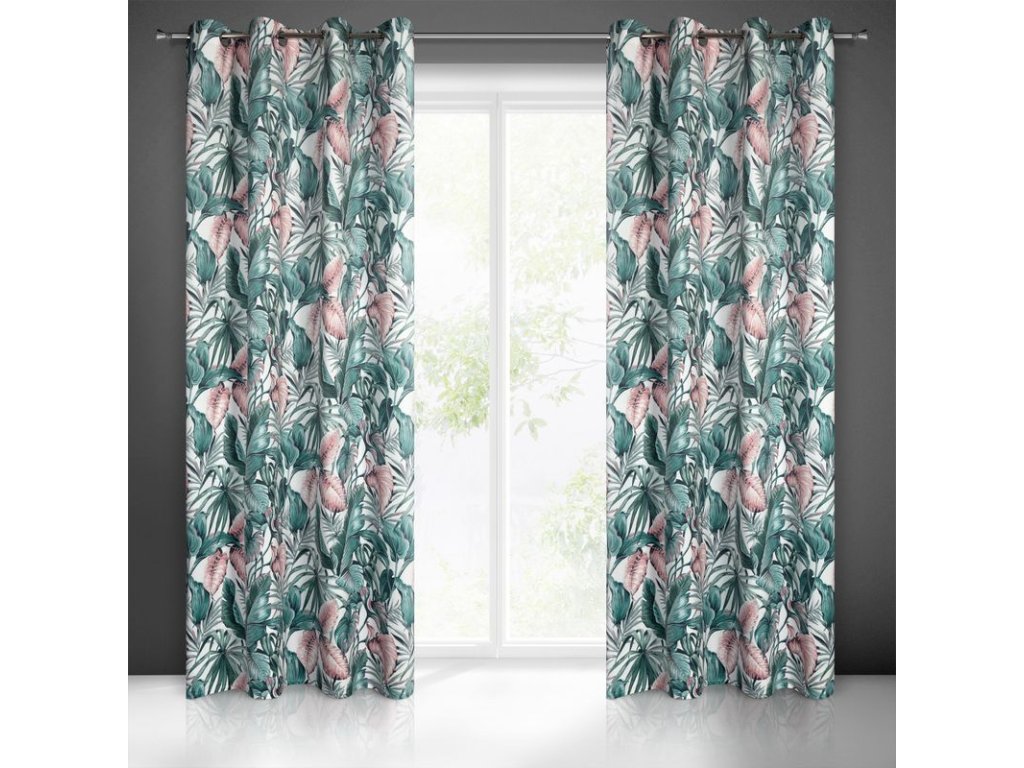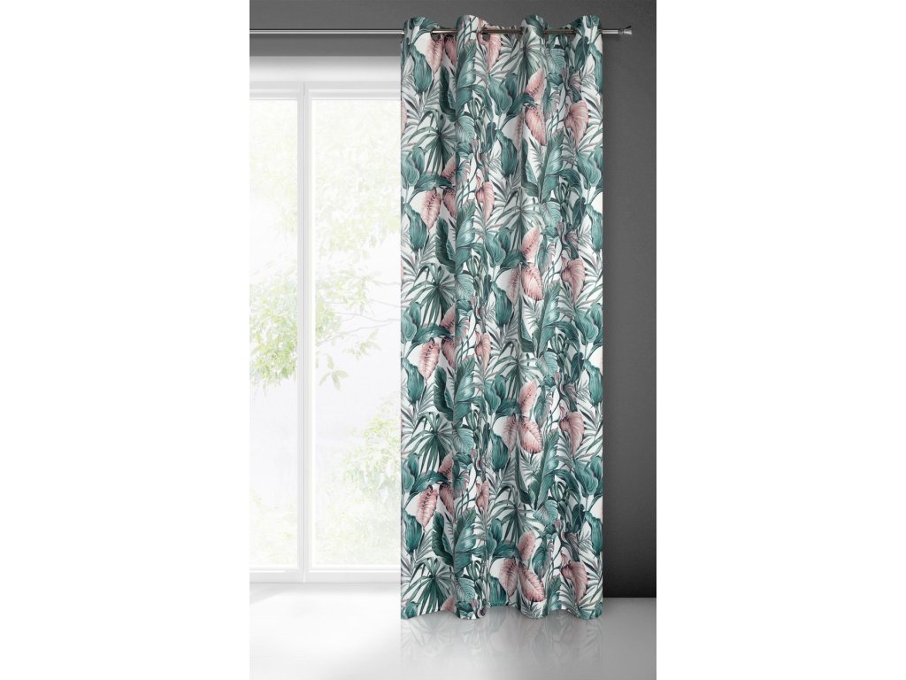 A fehér alapon zöld és rózsaszín színekben divatos növényi motívummal díszített, kellemes bársonyszövetből készült, puha tapintású függöny a modern és klasszikus enteriőrökbe tökéletesen illeszkedő kiegészítő.