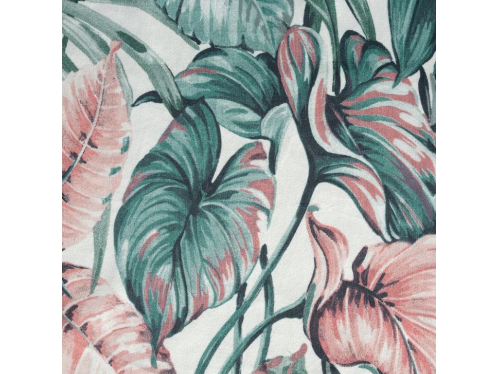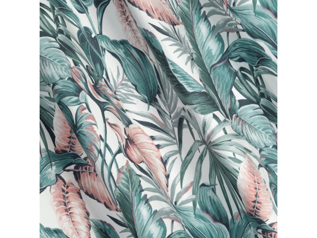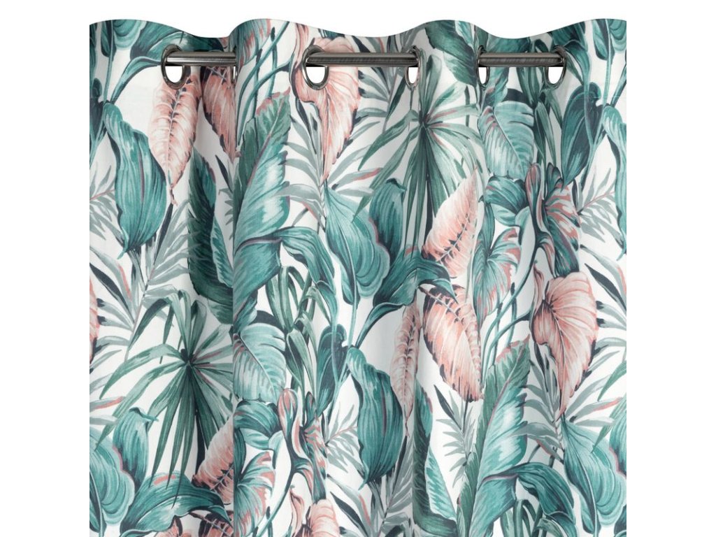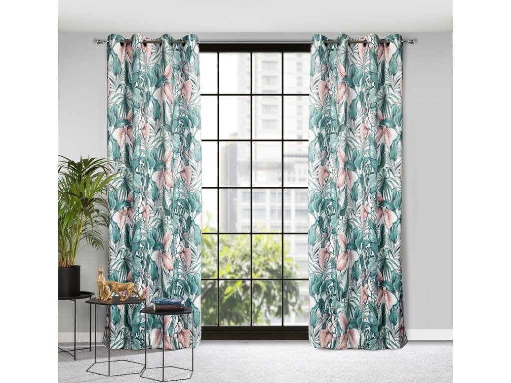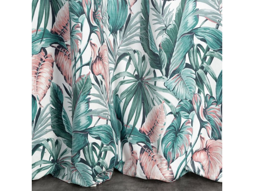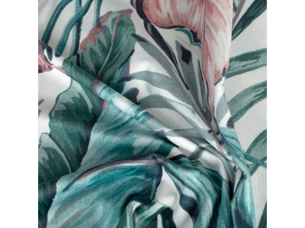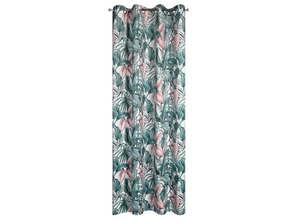 A fehér alapon zöld és rózsaszín színekben divatos növényi motívummal díszített, kellemes bársonyszövetből készült, puha tapintású függöny a modern és klasszikus enteriőrökbe tökéletesen illeszkedő kiegészítő.