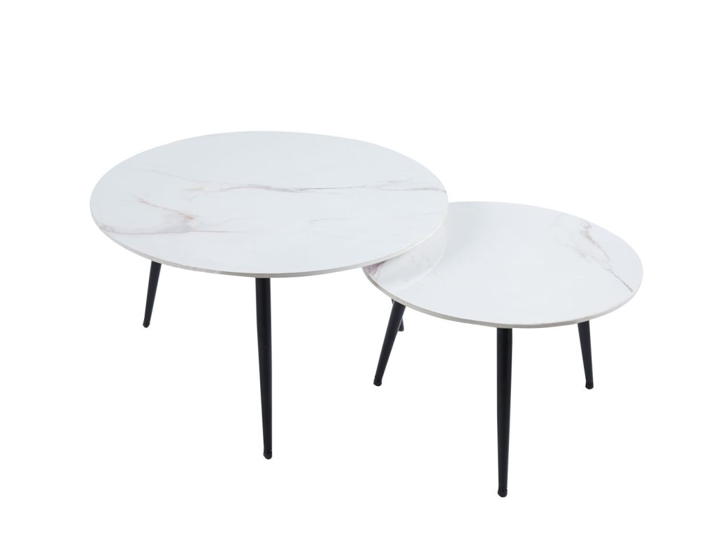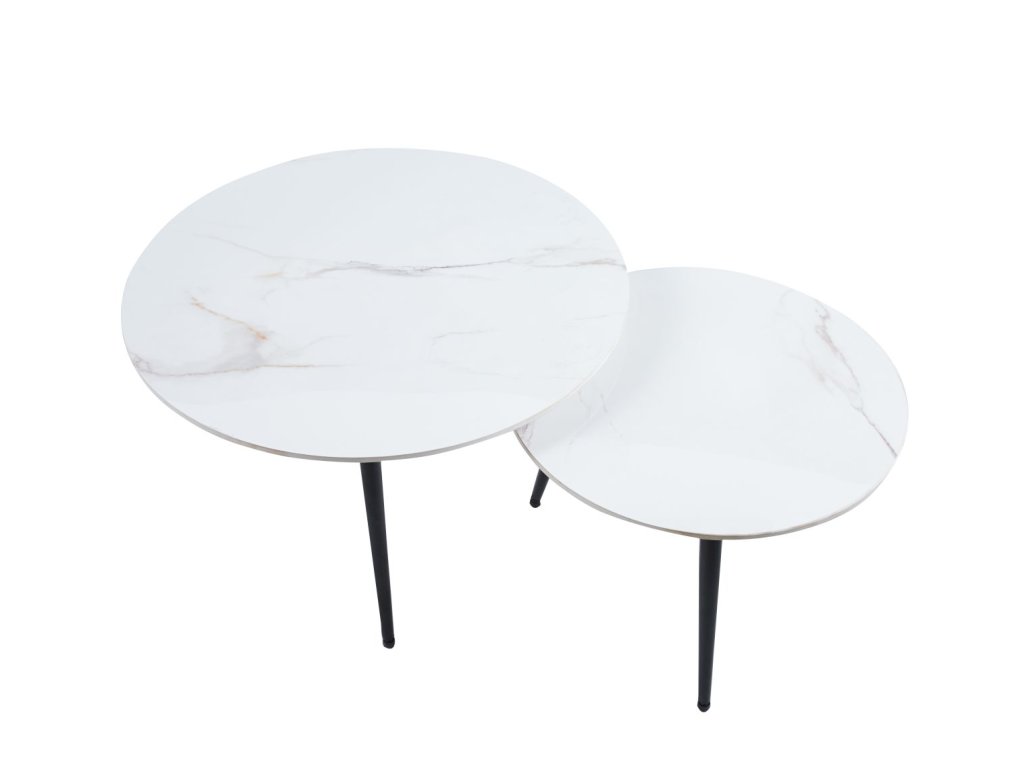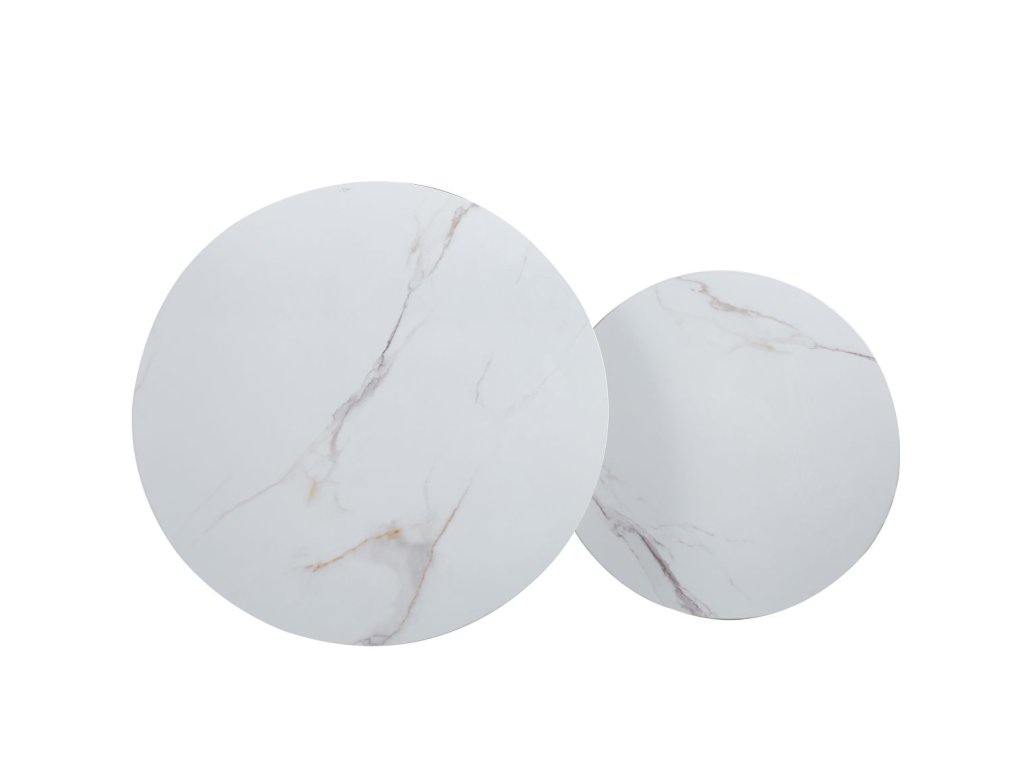 A nagyobb asztal 80 cm átmérőjű és 45 cm magas, míg a kisebb asztal 60 cm átmérőjű és 40 cm magas. A fényes, fehér márvány mintázatú kerámia munkalapok luxus megjelenést kölcsönöznek, amely egyszerre praktikus és könnyen karbantartható.