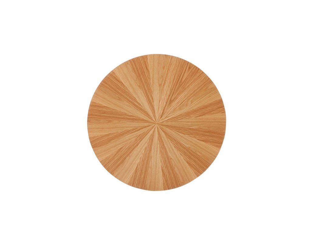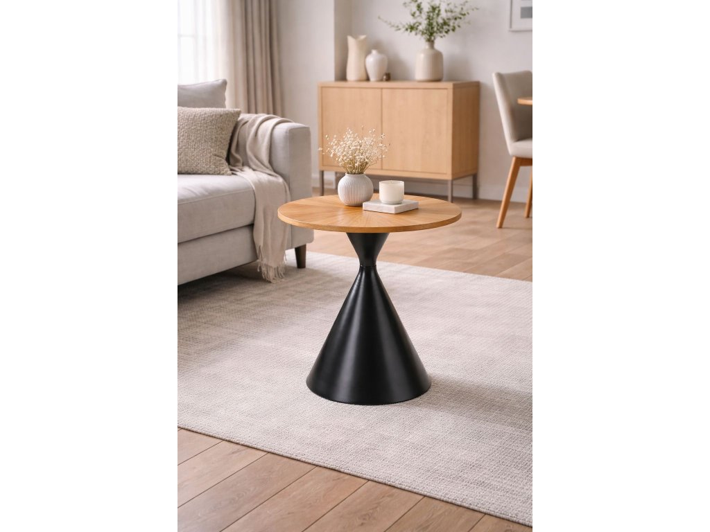 A finom faerezetű, kerek asztallap könnyednek és elegánsnak tűnik, míg a kúpos alakú, stabil fémláb eredeti karaktert és kiváló stabilitást kölcsönöz az asztalnak. Kompakt méreteinek köszönhetően az asztal ideális kisasztalként vagy dohányzóasztalként kanapéra, fotelbe vagy kisebb helyiségekbe.