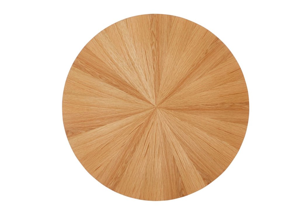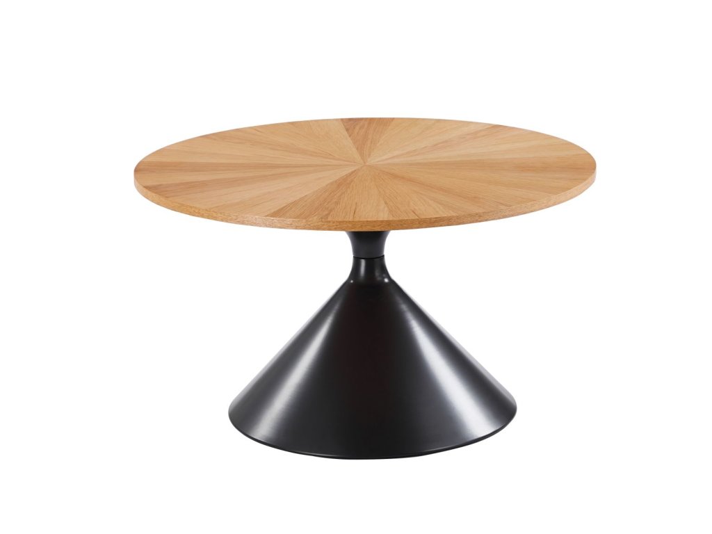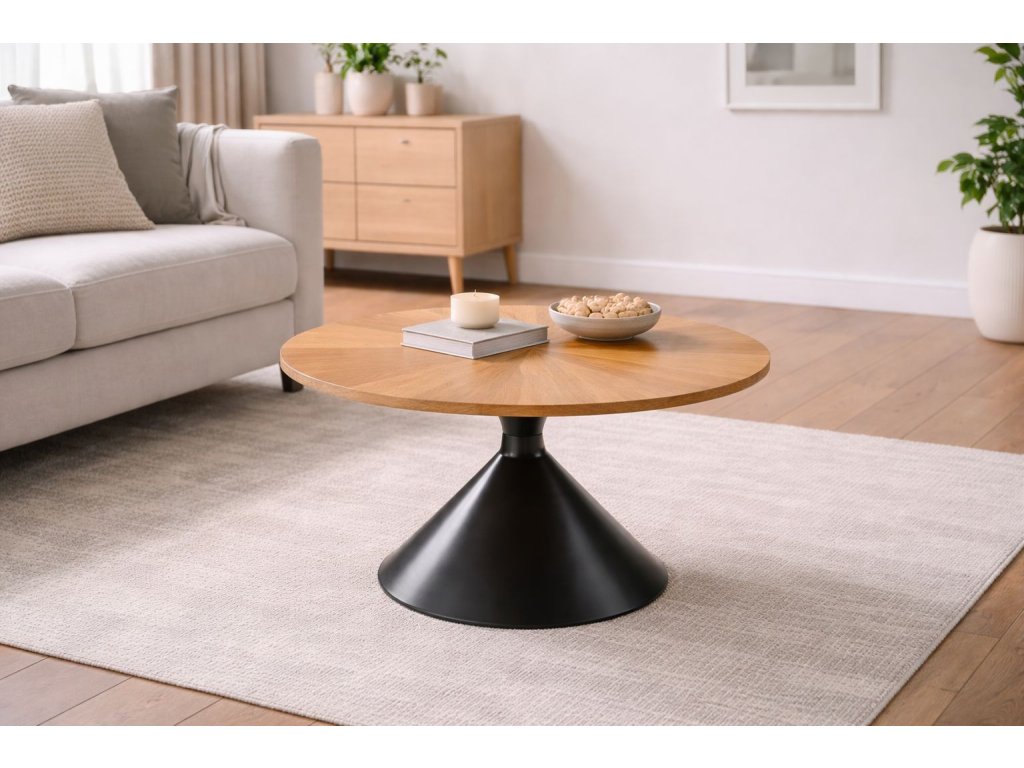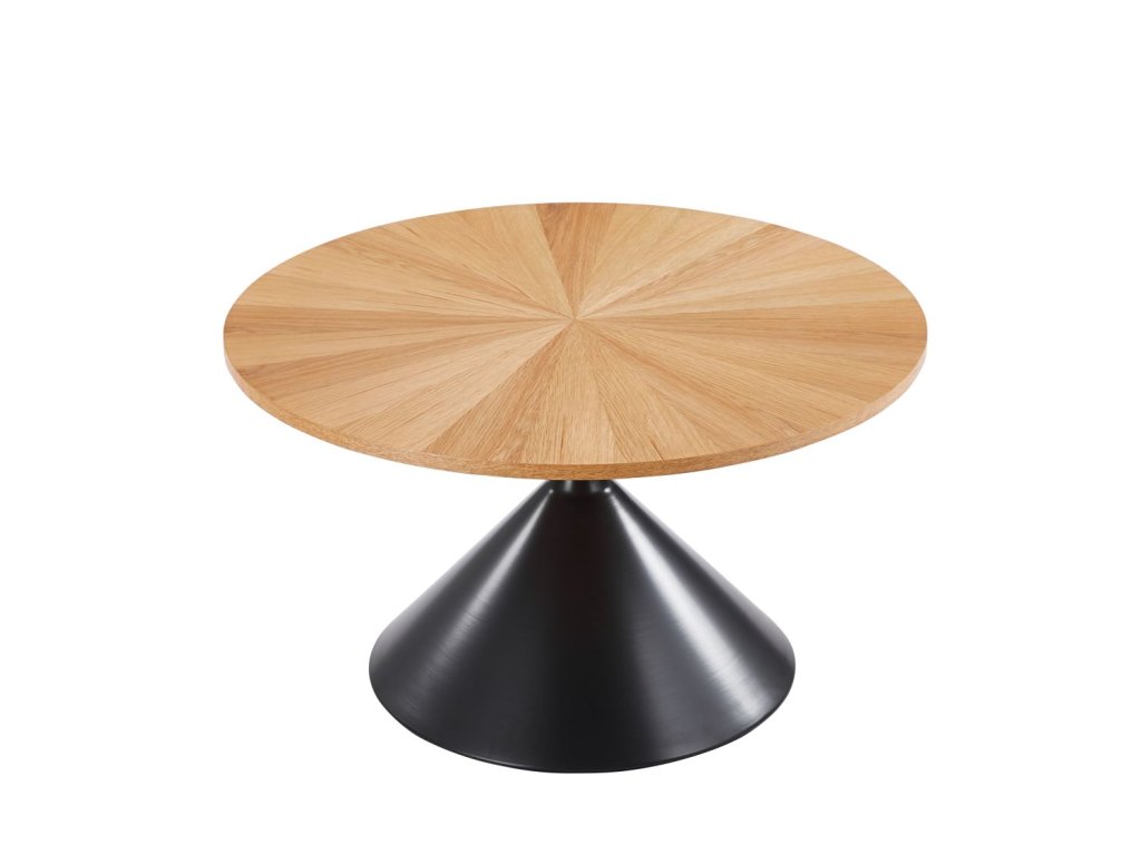 Az ORION 70 dohányzóasztal a természetes fadekor és a modern ipari formatervezés harmonikus kombinációját képviseli. A kerek asztallap elegáns, szimmetrikus, natúr tölgyfa árnyalatú faerezettel meleg és időtlen hatást kelt, míg a kúpos alakú fekete fém talp jellegzetes formai karaktert és vizuális stabilitást kölcsönöz az asztalnak.