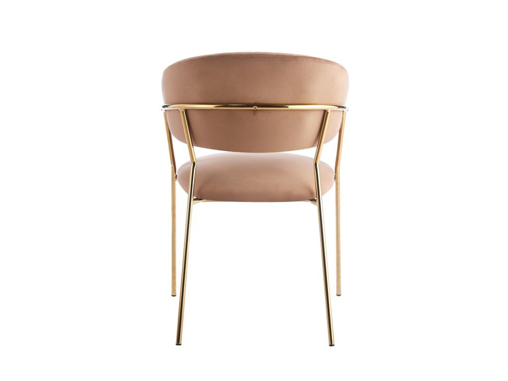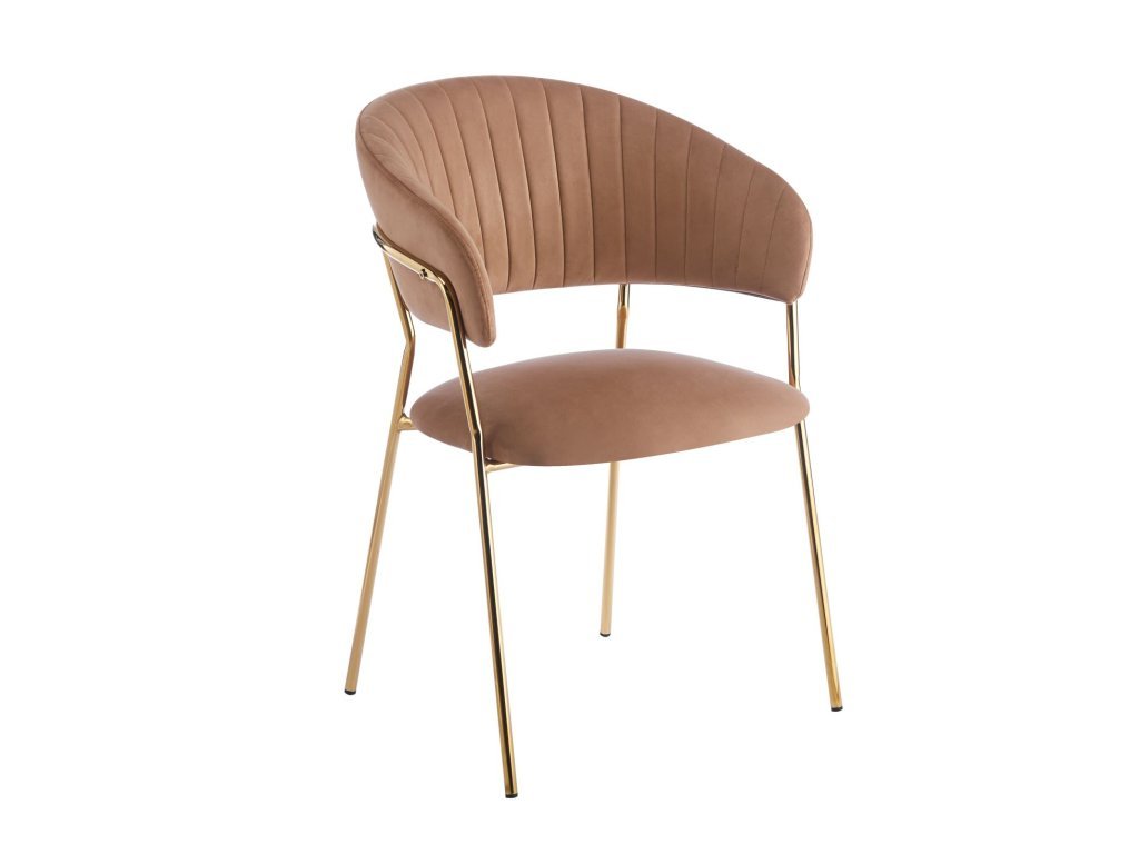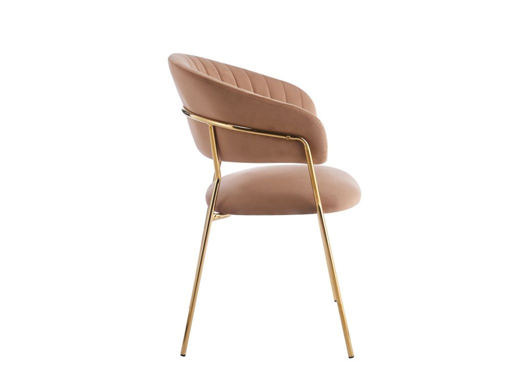 A cappuccino színű Glamour szék meleg, elegáns és modern megjelenést kölcsönöz. Puha barna-bézs velúrja harmonikus és luxus hatást kelt, míg az arany lábak kiemelik elbűvölő jellegét.