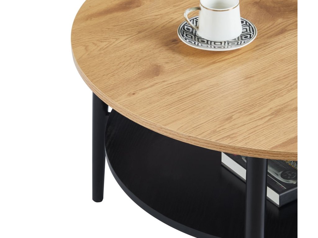 A NORDIC DUO Ø80 dohányzóasztal a fa természetes megjelenésének és a modern fekete eleganciának a stílusos kombinációja. A natúr tölgyfa dekorral díszített kerek asztallap melegséget és természetességet visz a belső térbe, míg az alsó fekete polc és a fém szerkezet modern, enyhén ipari jelleget kölcsönöz az egésznek.