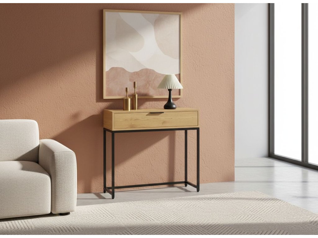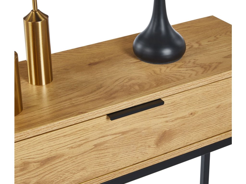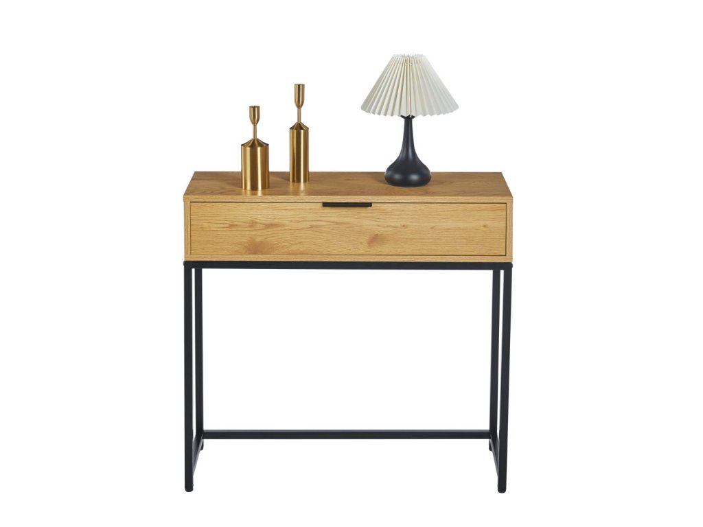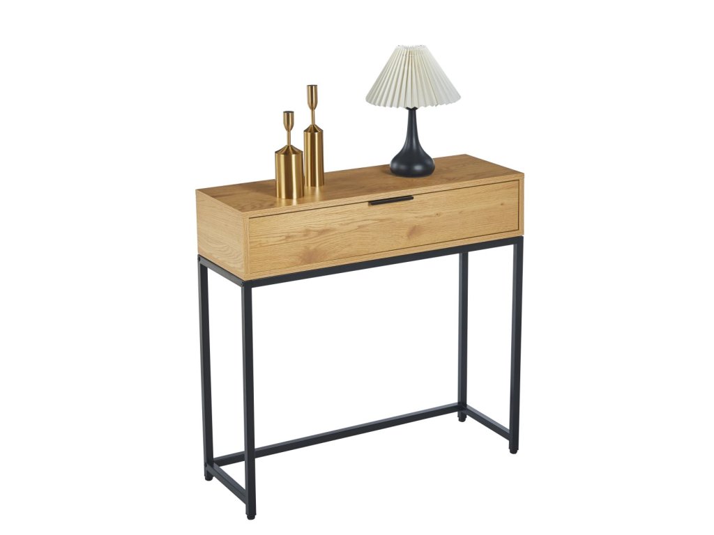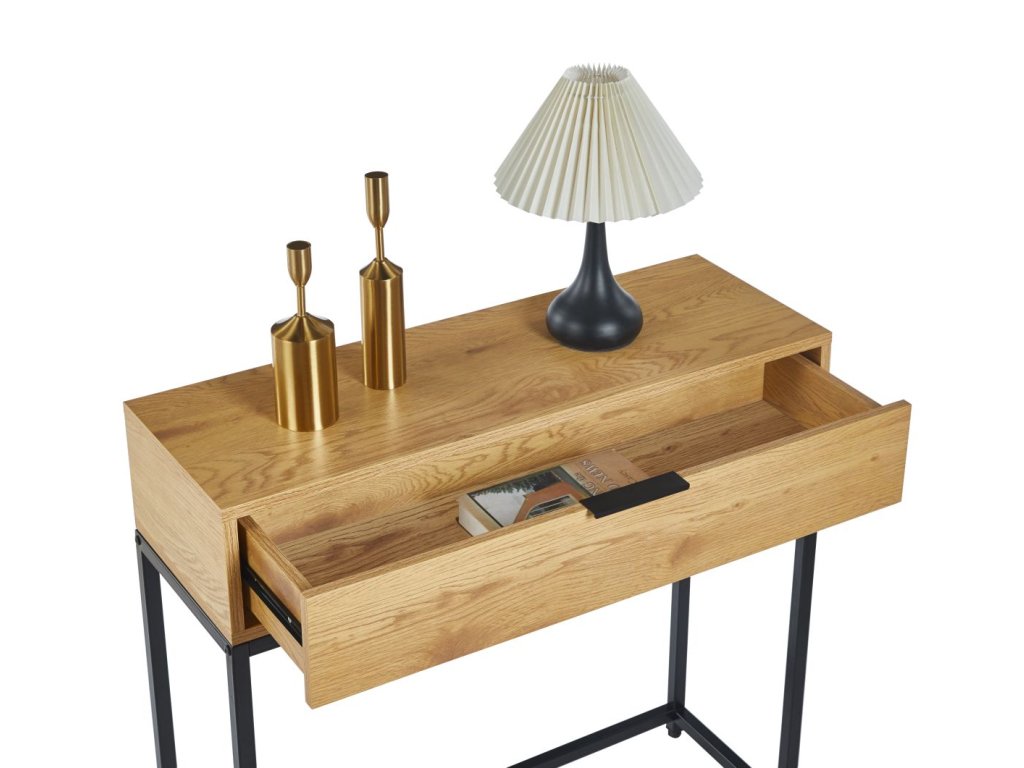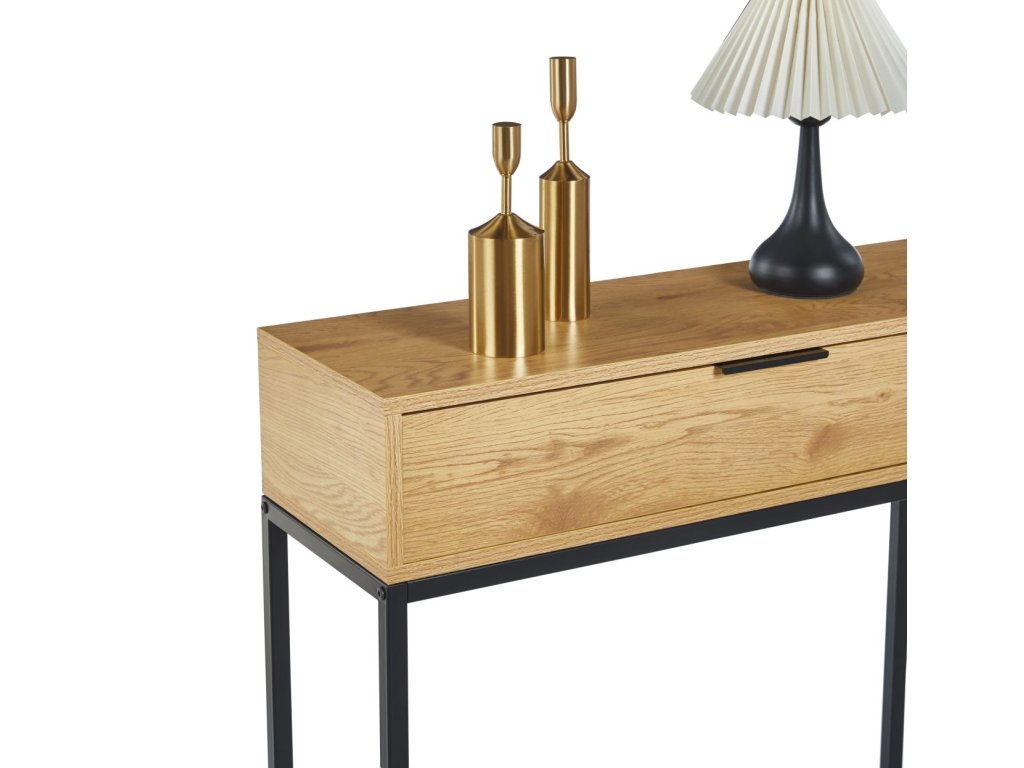 Egy praktikus fiók segít a rendszerezésben: elrejtheti az apró tárgyakat, például a kulcsokat, a leveleket vagy a kiegészítőket, amelyeket kéznél, de nem szem elől szeretnél tartani. A fa és a fekete fém kontrasztja időtlen, luxus megjelenést kölcsönöz, amelyet könnyen kombinálhatsz modern és klasszikus kiegészítőkkel egyaránt.