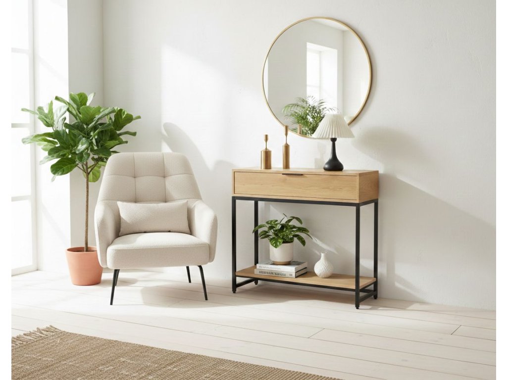 Egészítsd ki a konzolt egy kerek vagy ovális, fekete keretes tükörrel és egy semleges tónusú kulcstartóval vagy vázával. A natúr tölgyfa fonott vagy kerámia kiegészítőkkel is remekül mutat.