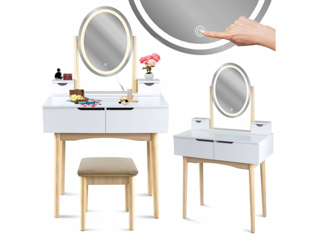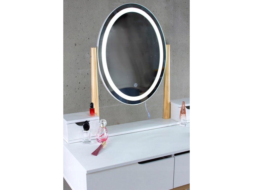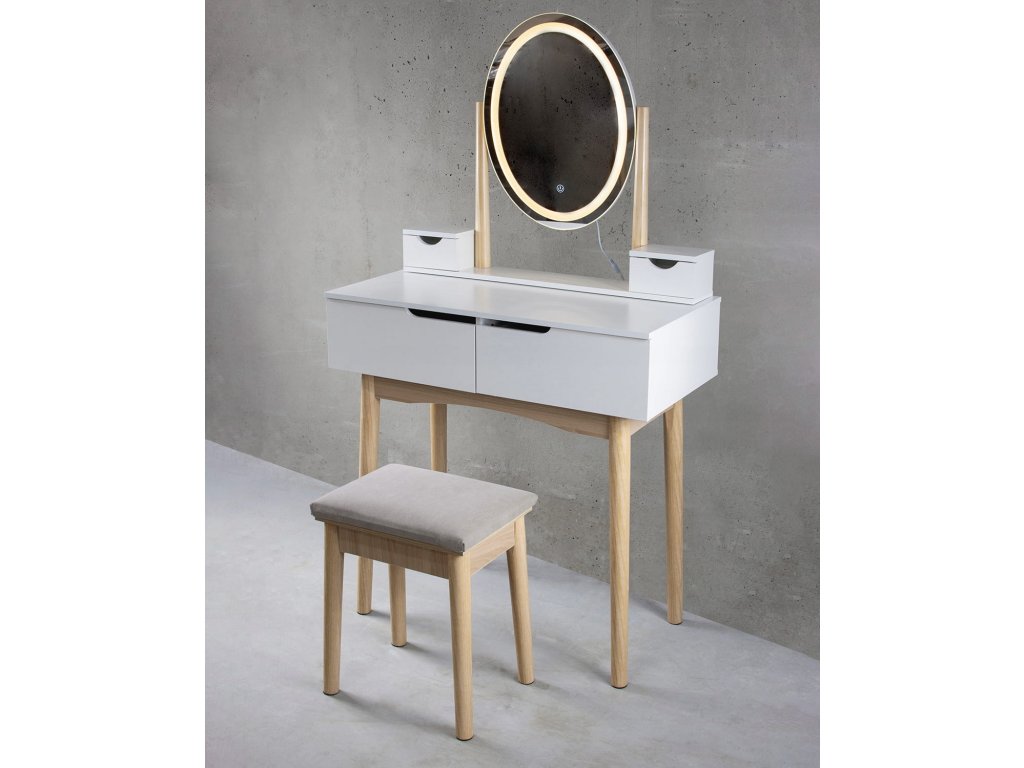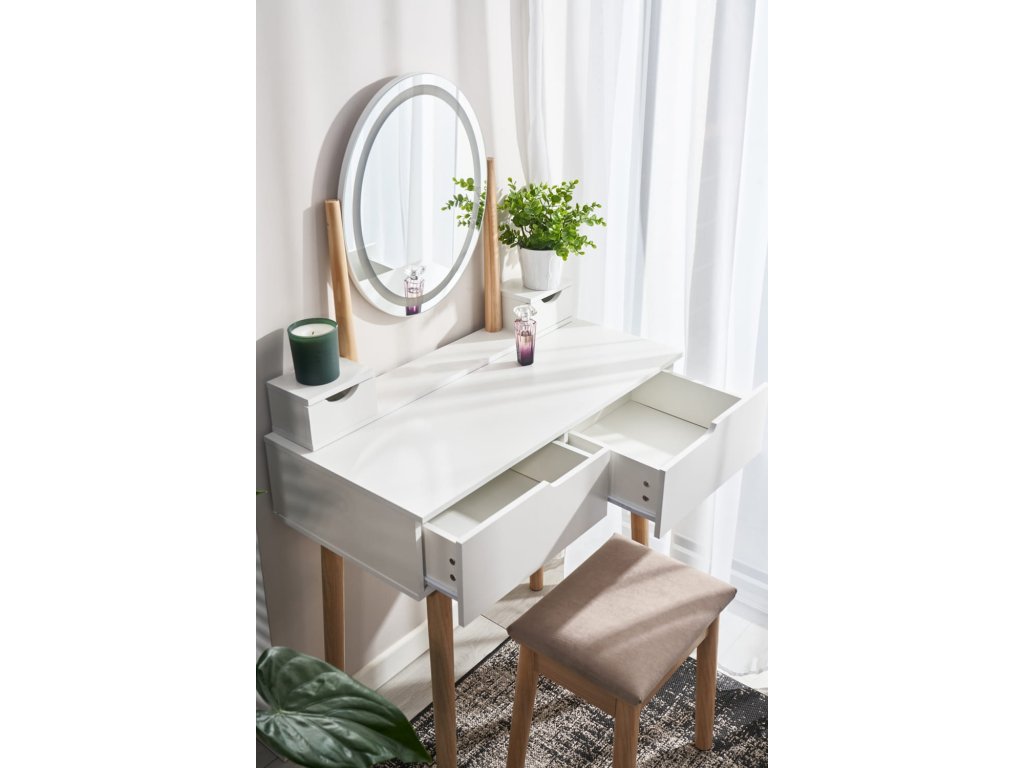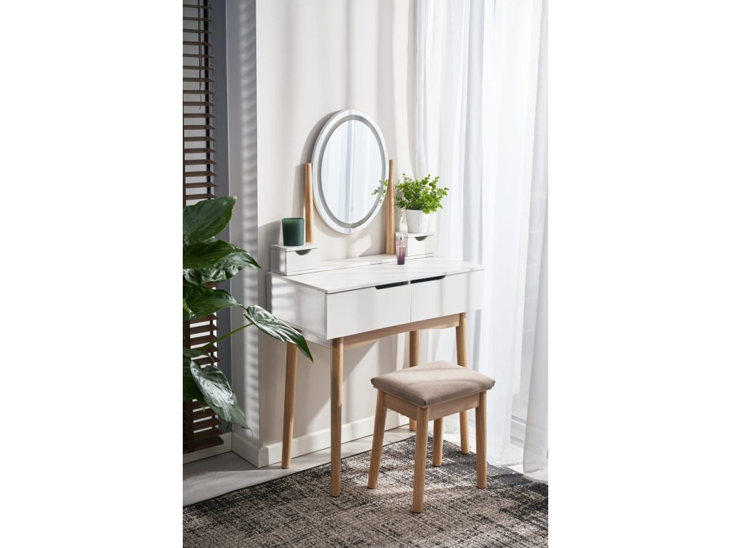 Öltözőasztal ovális LED-es tükörrel és bézs színű székkel