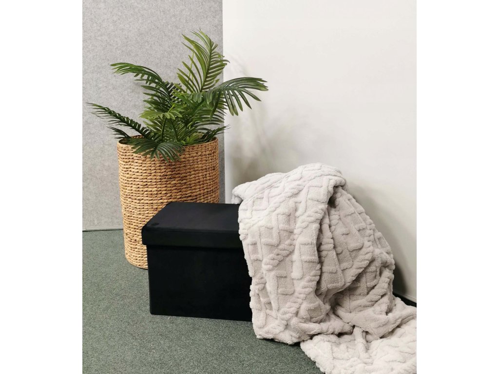 A masszív és stabil konstrukció vastag poliuretán habbal kiegészített bútorlapból áll, ami növeli az ülési kényelmet. A felület kellemes tapintású anyaggal van bevonva, így a zsámoly elegánsnak és egyben praktikusnak tűnik a mindennapi használatra. Összecsukható zsámolyként kisebb helyiségekbe is ideális, ahol értékelni fogja az ülőhely és a tárolóhely gyors bővítését.
