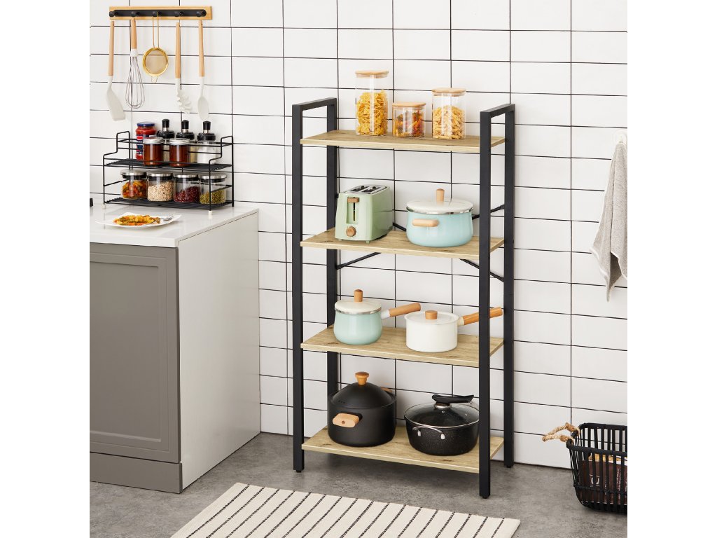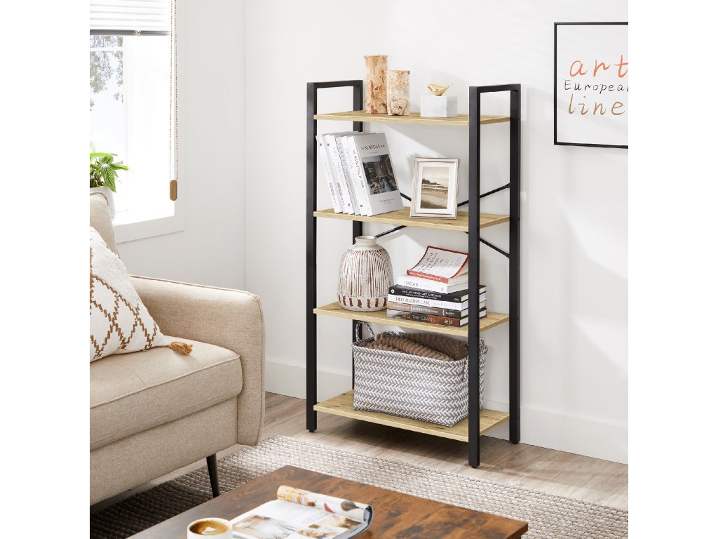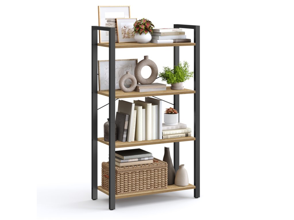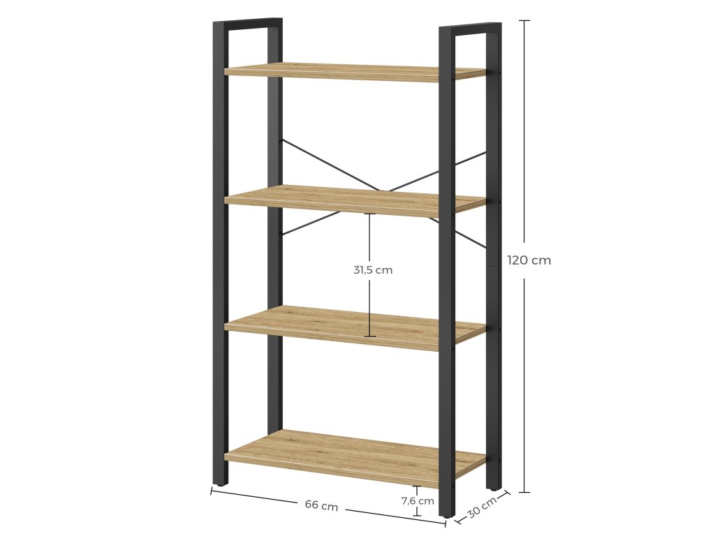 Négy nyitott polc rengeteg helyet biztosít könyvek, cserepes virágok, képkeretek vagy dizájner kiegészítők rendezett tárolására. A masszív acélszerkezetnek és a kiváló minőségű forgácslapnak köszönhetően a polc stabil és mindennapi használatra alkalmas.