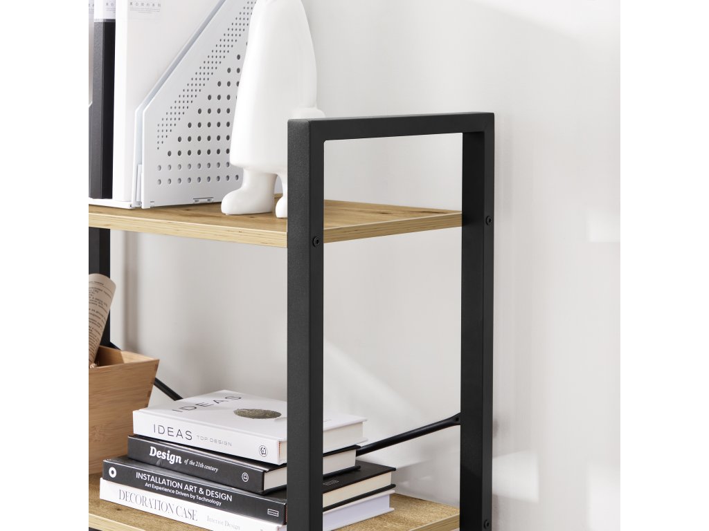 A modern , tölgyfa kézműves dekorral ellátott polc praktikus és egyben dizájnos megoldás könyvek, növények és dekorációk rendszerezésére. A meleg fadekor és a fekete fém szerkezet kombinációja időtlen loft megjelenést kölcsönöz, amely természetesen illeszkedik a modern, ipari és minimalista enteriőrökbe.