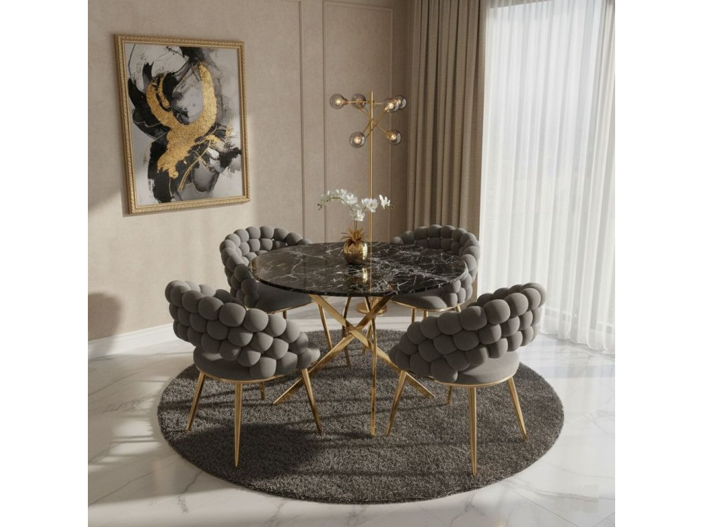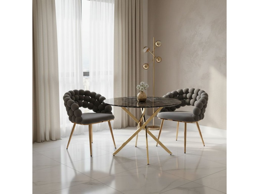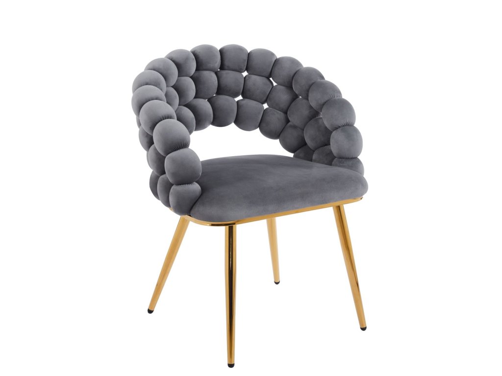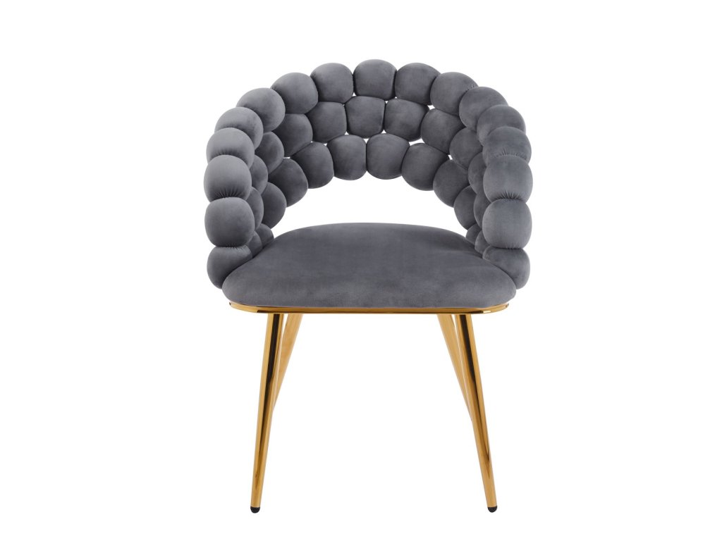 Az arany színű, stabil króm szerkezet szilárdságot, tartósságot és vizuális kontrasztot biztosít a szürke kárpitozott anyaggal. Az ergonomikusan formázott ülés és a lekerekített háttámla magas kényelmet biztosít még hosszabb használat során is, akár az étkezőasztalnál, az íróasztalnál vagy egy pihenőhelyen.